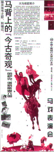 这是一则令人瞩目的报纸广告,究其原因,除了彩色起强势规律的作用外,更重要的是版面编排的形式和技巧:第一,它大胆地在横排报纸中釆用“顶天立地”的竖幅形式,占领了该版面的优势地位;第二,它运用照片剪贴技巧,把两张照片进行有目的的组合,形成了上重下轻、倾斜不稳的构图,表现了马戏表演的动感和技巧。广告用黑体字突出了“马背上”的“今古奇观”,先引起读者的注意和兴建,然后用小字详细介绍马戏团的阵容和节目,既有票价,表演时间、地点,也有优惠办法,给读者提供了全面的信息。