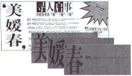 广告是以系列的文字形象推出的,强化“美”、“缓”、“春”三个字的视觉传递。这三个字既是品牌又隐含养血口服掖的功效,加强了“美缓春”的寓意效果,达到促销的广告目的。 |