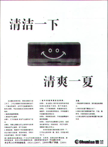 专家评语: 夏季将临是空调广告大战之时。“春兰”采用与众不同的诉求,针对已购空调的用户,从服务入手 ,介绍清洁与保养方法,取得用户对企业的良好印象。该广告同时影响湷在购买者,增进其对春兰空调的信心和亲和力,创意上可谓“一石二鸟”。整个广告策略明确,主题鲜明,信息清晰而有效。广告标题朗朗上口,易读易记,“清爽”一词一语双关加深对产品的好感度。设计上简洁醒目,大胆地在产品空调器上用阴线勾划出会心笑态的表情,具有强烈的双关暗示性。该广告不乏为一个具有竞争力与促销的广告。