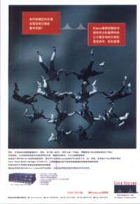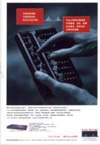 把"跳伞"、"算盘"、"小鞋"等几个毫无相干的现象和物品串连在一起,来比喻CISCO多元化的技术能力,将难以理解的技术语,转换成常见的又容易办到的事,变繁为简。创意巧妙,运用借喻手法,将意外变成熟悉。画面制作精良,是一幅幅运用形象的说明文。