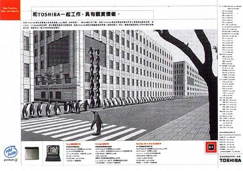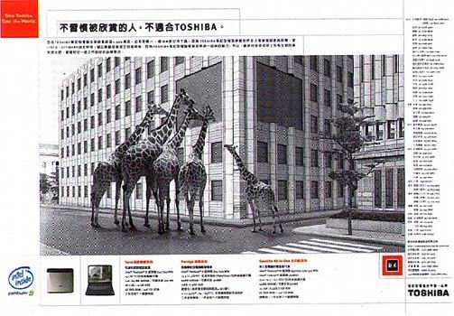作品名称:TOSHIBA电脑系列 — 长颈鹿篇/企鹅篇 广 告 主:新禾 TOSHIBA 广告代理:意识形态 业务服务:陈信伶 文 案:柳慧萍 客房总监:张凯伦 创意总监:许舜英 美术指导:包益民