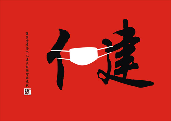 不知未来的健康会怎样,但我现时要做的是预防疾病的发生。预防也是抢救健康的最好方法,画面由口罩把健字分成单人旁与建字组成中国书法的形式,隐喻着每个人建立起预防疾病的常识。
